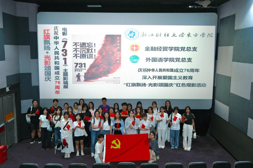 为庆祝中华人民共和国成立七十六周年,引导广大师生厚植家国情怀、赓续红色血脉,金融经贸学院党总支联合外国语学院党总支共同组织师生赴影院开展“红旗飘扬·光影颂国庆”红色观影活动,集体观看历史题材电影《731》,以特殊的“历史课堂”为国庆献礼。