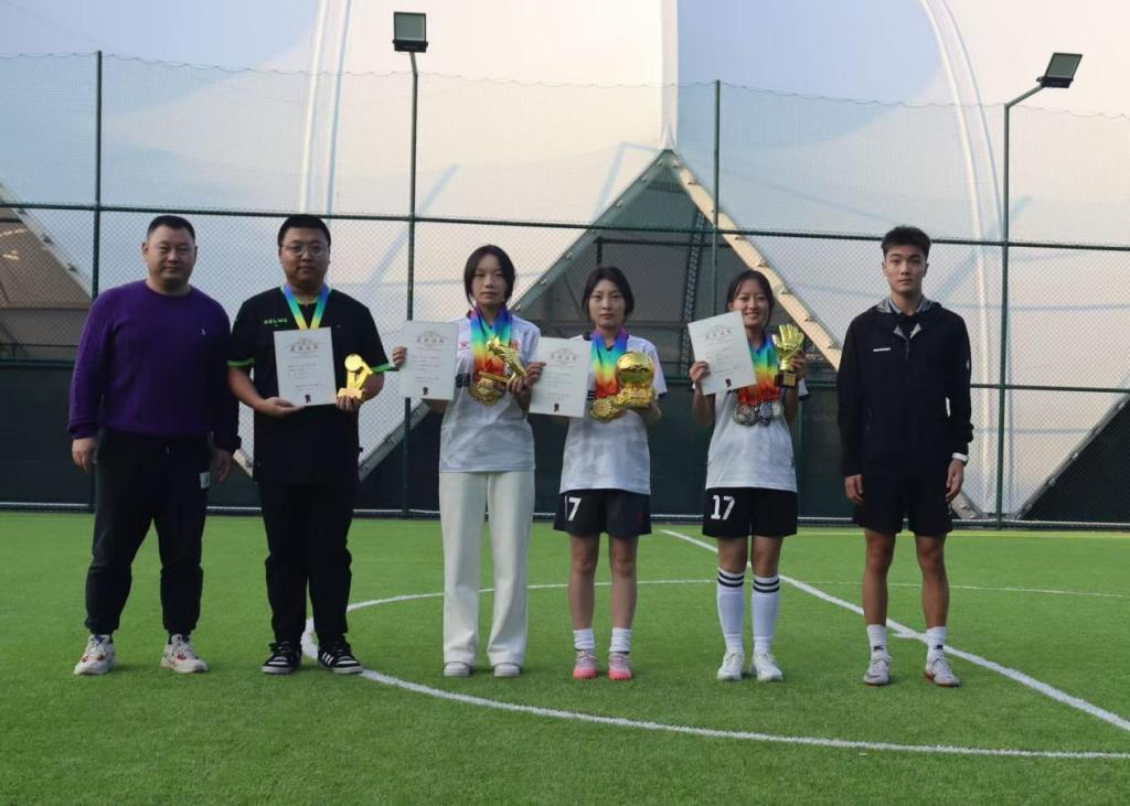 决赛场上,气氛紧张到极致。双方队员实力相当、互不相让,攻防转换节奏飞快。金融与经贸学院女足顶住了巨大的压力,凭借坚韧的毅力和出色的临场发挥,17号球员骆萱以一颗颗不讲理的世界波撕开对手的防线,11号球员罗孜怡在前场拼命压制对手的进攻,6号球员林渊乐以自己敏锐的嗅觉抓住进攻和防守的每个机会,为团队建立巨大优势,门将何雨暄以一次次的猛扑拦截对手的射门,始终牢牢掌控着比赛的主动权。关键时刻,队员们心往一处想、劲往一处使,以默契的配合撕开对手防线,成功打入制胜一球。终场哨响,全场沸腾,尽情庆祝这来之不易的胜利,她们的呐喊与欢呼,成为赛场上最动人的旋律。同时也热烈祝贺我院球员林渊乐、骆萱拿下第八届女足锦标赛金靴奖和金球奖!裁判许睿拿下金哨奖!