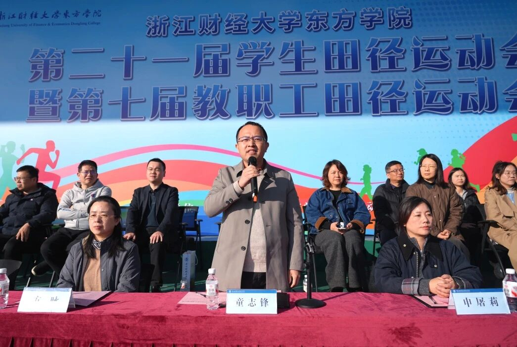 2025年11月20日,浙江财经大学东方学院第二十一届学生田径运动会暨第七届教职工田径运动会在田径场隆重开幕。学院领导班子成员,各代表团团长、领队及相关部门负责人出席开幕式。学院院长童志锋宣布开幕。学院党委书记申屠莉致开幕词。开幕式由学院学术副院长姚莉主持。