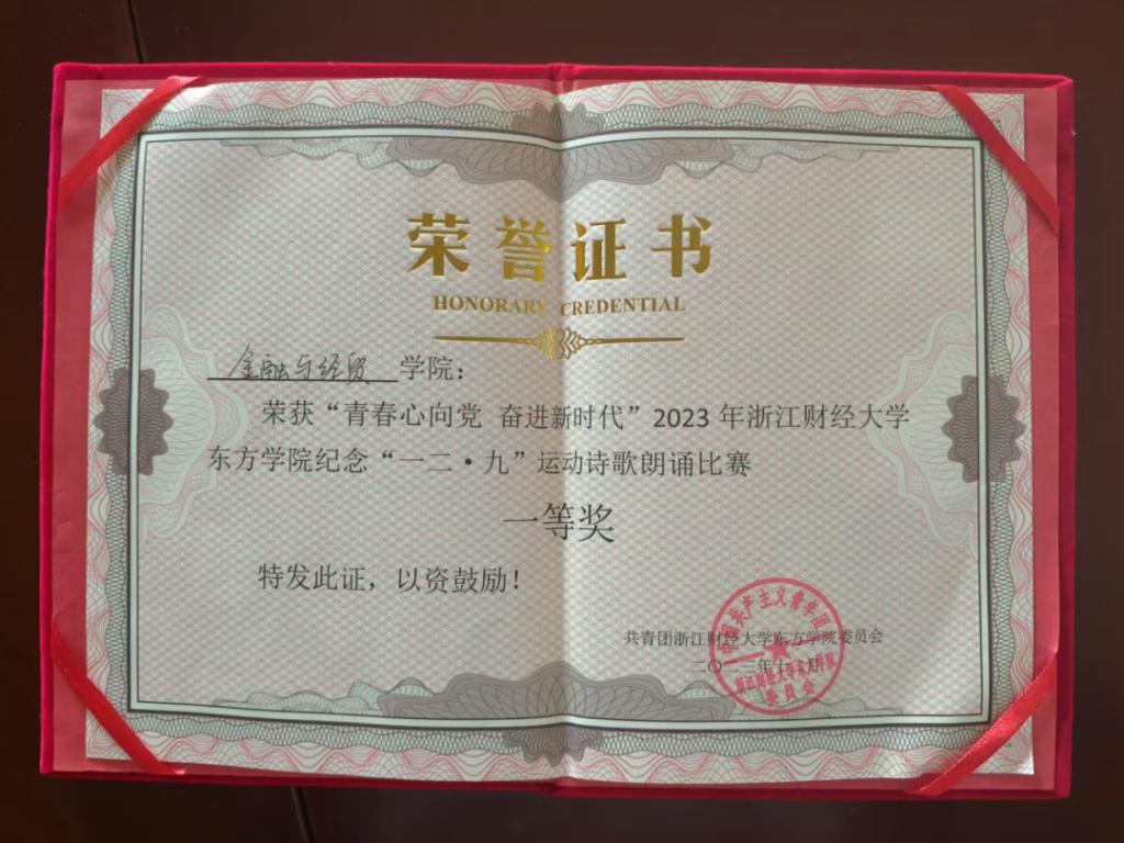 《青春赴壮志,奋斗正当时》获浙江财经大学东方学院纪念一二·九运动诗朗诵比赛一等奖。