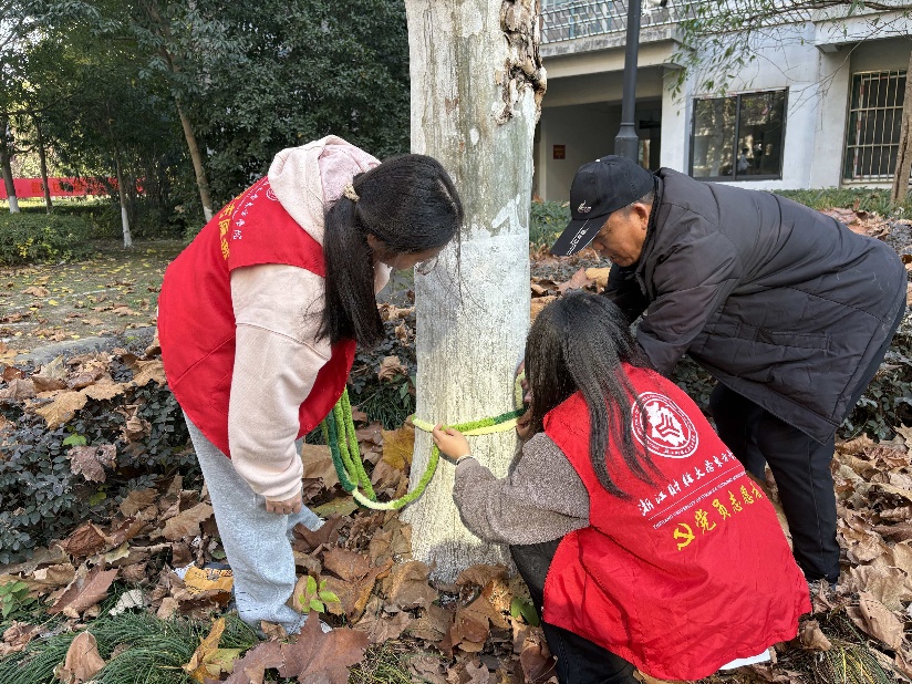 为强化劳动实践育人实效,深入践行绿色发展理念,推动党建工作与劳动教育、校园生态保护深度融合,12月9日下午,金融与经贸学院党总支联合外国语学院党总支、后勤基建部党支部共同开展“冬季树木穿衣”主题实践活动。学生党员与入党积极分子积极响应、主动参与,以“定制化防寒+创意化装饰”的方式为校园树木制作“暖冬防护衣”,用实干行动诠释责任担当,让党建活力在生态实践中充分彰显。
