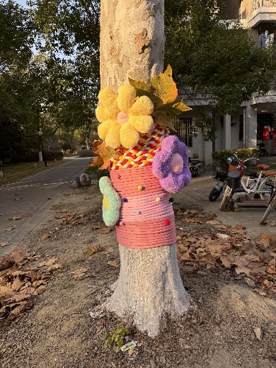 待树木“穿衣”工作全部完成,学生党员与入党积极分子拿出提前准备的“心愿梧桐叶”。叶片上不仅写有“愿校园绿意常在,盼学子前程似锦”等暖心祝福,还附有简易的树木养护小知识。大家小心翼翼地将“心愿叶”插在防寒衣缝隙中,金黄的叶片与洁白的保温棉相映成趣,在冬日阳光的映照下更显温馨动人,为校园增添了一抹灵动暖意。