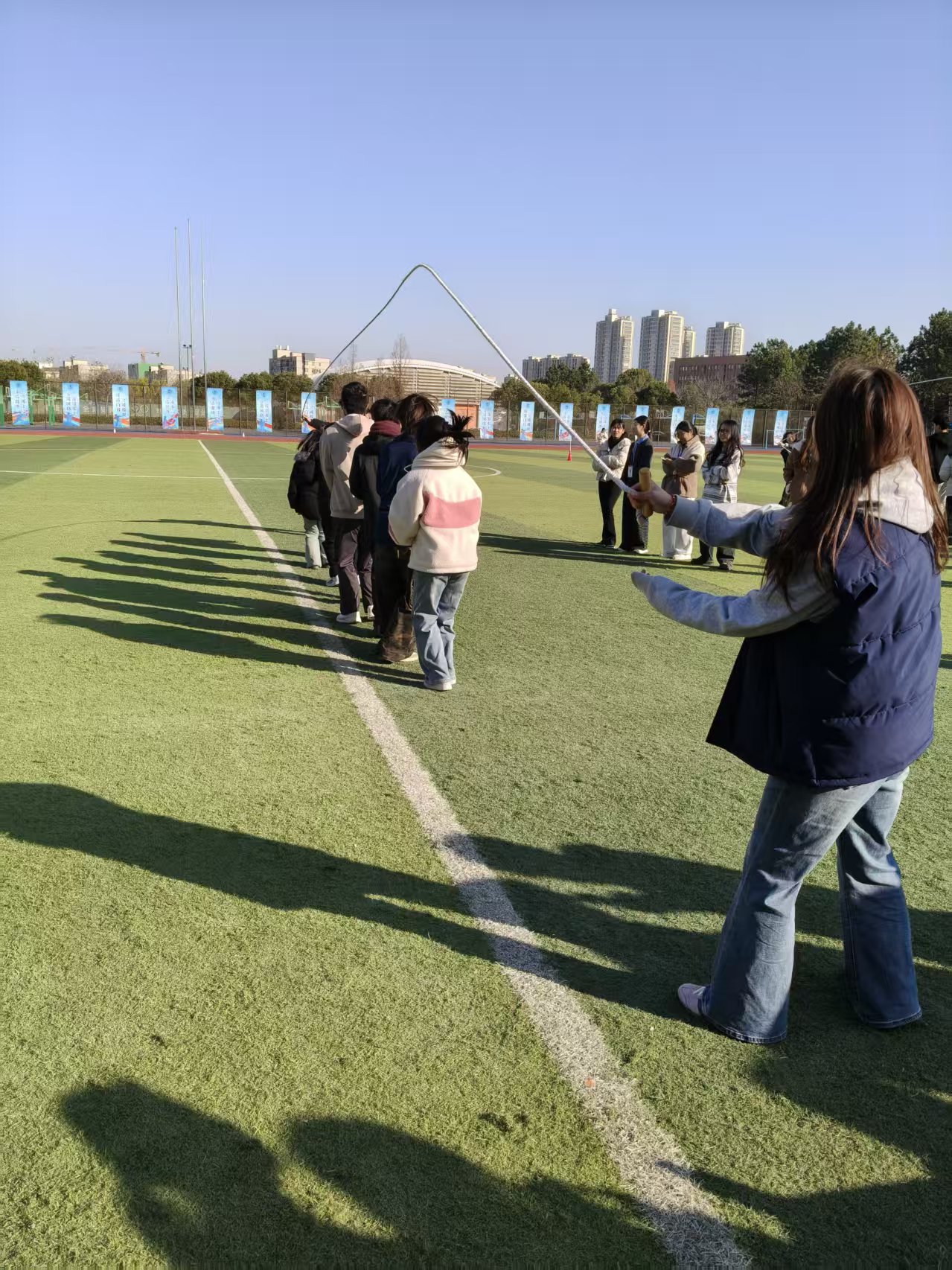 跳大绳赛场则是耐力与配合的较量,每队10人分工明确,2名摇绳员匀速摇绳,8名跳绳员男女比例均等,在2分钟内齐心跳跃。失误后迅速调整、不中断计时的坚持,让有效跳跃的分数不断累积,分数相同时的加赛环节,更是将现场紧张氛围拉满,我院选手们不怯场,尽情展示出十分强的凝聚力 配合也比较出色 最终获得第六名的成绩。