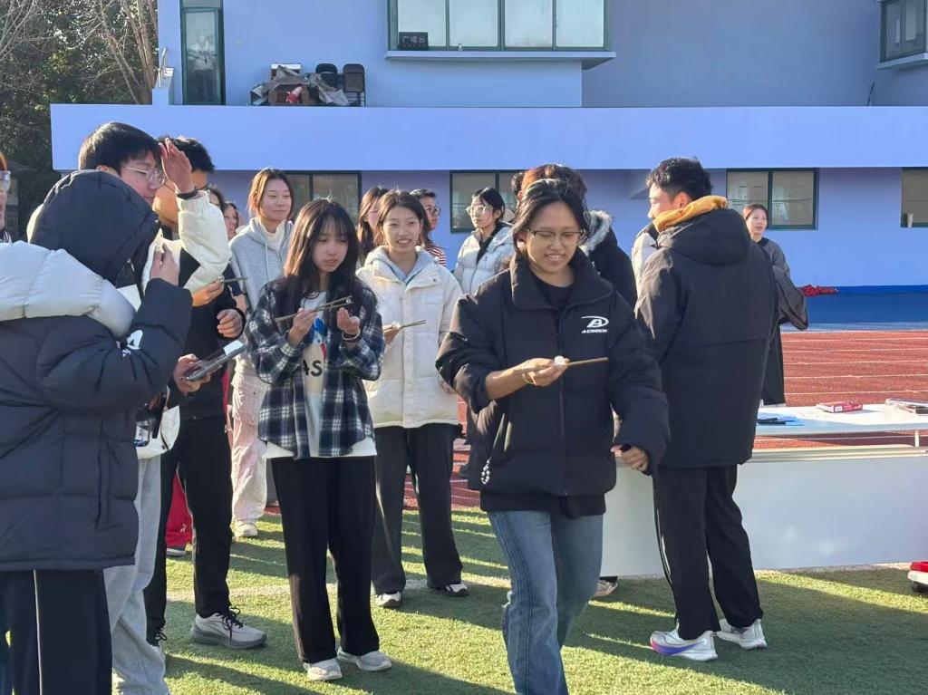 筷子夹球项目充满趣味与挑战,六名队员在两分钟内轮流用筷子夹起玻璃球,将其从10米外的起点运送至终点容器。我院选手在速度与精准度之间寻找平衡,指尖的灵巧操作与团队的轮换配合,成为获胜的关键 。我院凭借出色的发挥以及团队间的相互鼓舞, 最终获得第一名的好成绩。