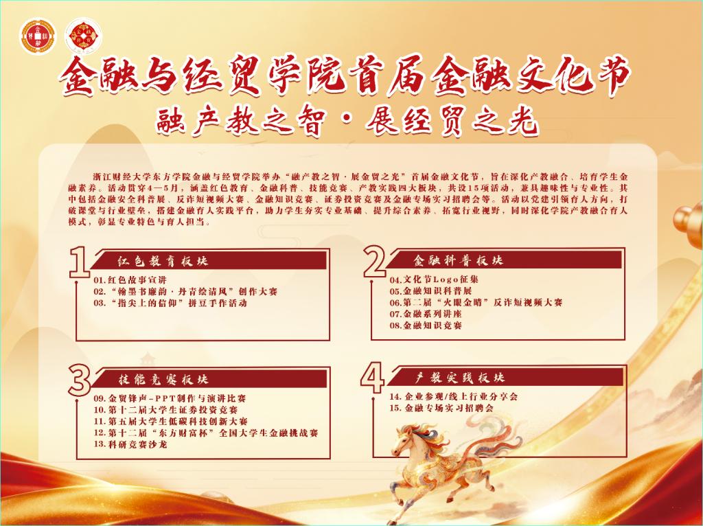 为深化产教融合,厚植学生金融素养,浙江财经大学东方学院金融与经贸学院首届金融文化节--“融产教之智·展金贸之光”将于4月15日正式启幕!本次文化节以多元活动为载体,打造专业与趣味兼具的金融育人盛宴,诚邀师生共赴赋能成长之约。