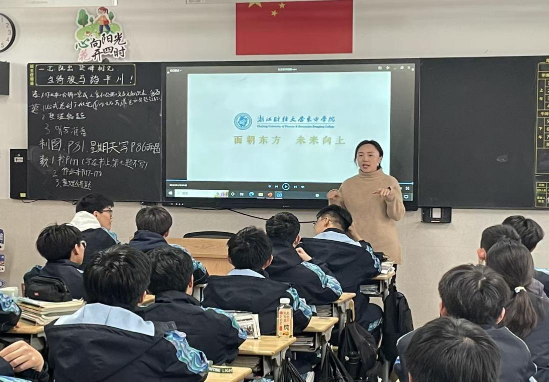 活动现场,郭老师首先代表学院向鄞州职教中心学校的师生们表示诚挚问候,随后围绕浙江财经大学东方学院的基本情况与核心优势展开详细介绍。她从学院的办学定位、学科设置、师资力量、校园环境等方面切入,重点展示了学院完善的教学设施——包括现代化的多媒体教室、设备先进的实训实验室、藏书丰富的图书馆、功能齐全的运动场馆以及舒适便捷的生活配套设施,让在场学子对学院的硬件条件有了直观且全面的认识。