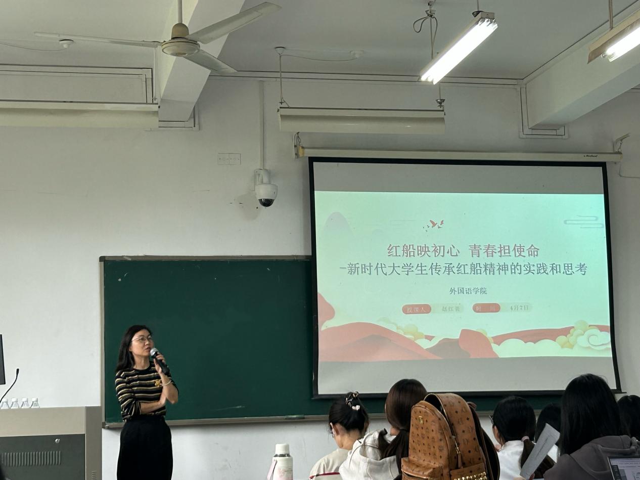4月12日,外国语学院党总支书记赵红英于1J312讲授《红船精神》主题党课。课程聚焦红船精神的时代内涵与价值要义,系统阐释开天辟地、敢为人先的首创精神,坚定理想、百折不挠的奋斗精神,立党为公、忠诚为民的奉献精神三大核心内容。赵红英老师结合党史发展与新时代青年使命,深度解读红船精神的历史底蕴与现实意义,阐明其作为红色精神源头的育人价值与指引作用,引导学员深刻感悟红色初心、坚定理想信念,从红船精神中汲取奋进动力,以昂扬姿态勇担新时代青年使命。