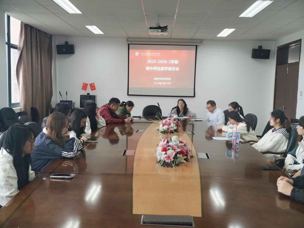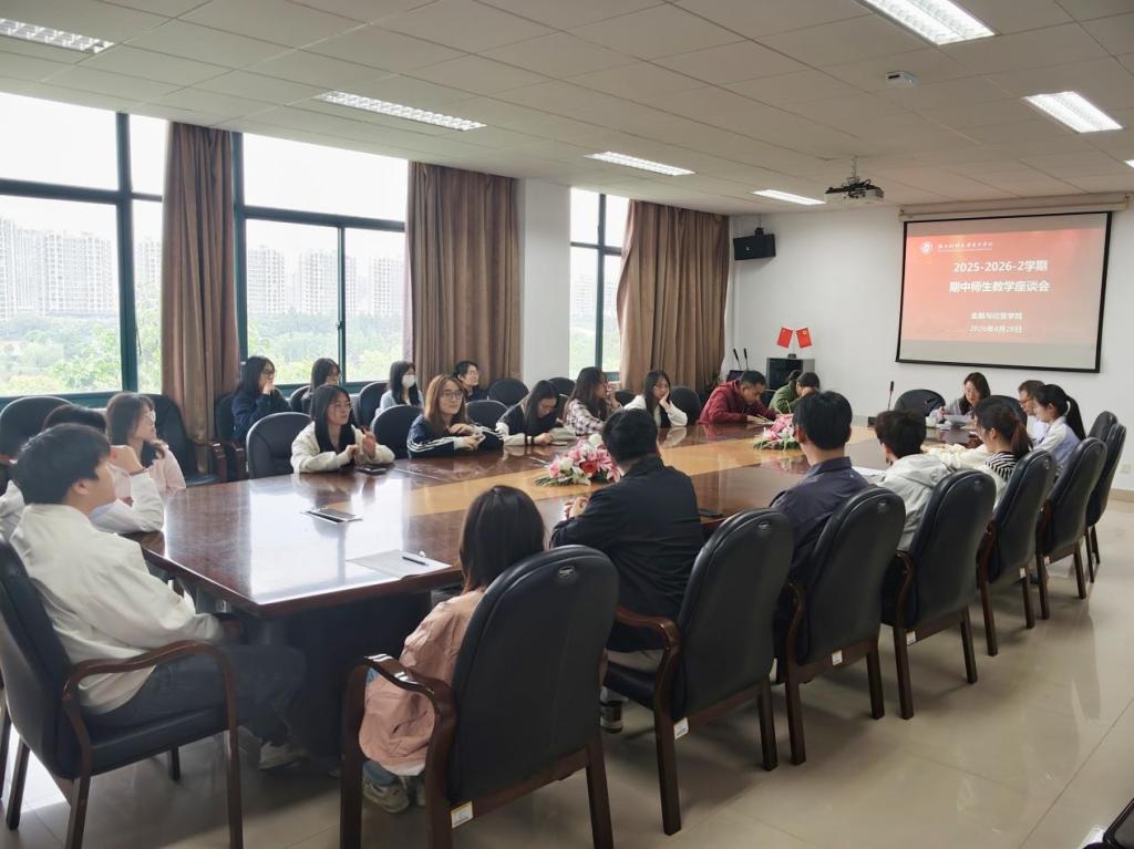为进一步了解学生学习生活情况,畅通师生沟通渠道,提升教育教学与管理服务质量,2026年4月28日,金融与经贸学院在J1-506召开2025-2026学年第二学期期中师生座谈会。学院副院长李乐、学院督导组组长孙晓峰、成员黄文平、刘睿伣以及各班学习委员参加会议。会议由李乐主持。